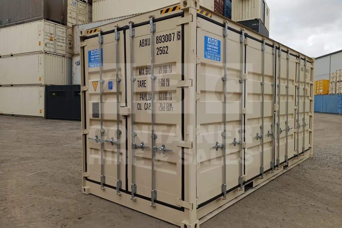 Rank 9 out of 10 new build cream 20 foot high cube full side opening (RHS) shipping container in Brisbane. (ABXU8930076)
